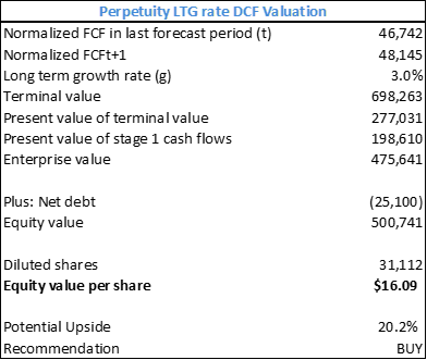 - Perpetual LTG DCF estimates a target share price of $16.09 with ~20% upside and a total return of 23%; which is also supported by EV/EBITDA Exit-Multiple of 11x at $18.85 with a 32% price upside potential and a total return of 35%.