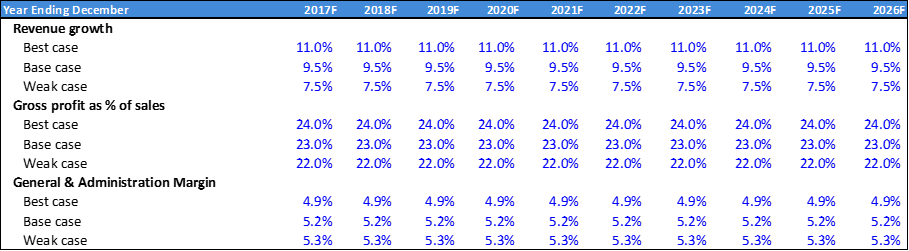 I have built 3 scenarios (Base, Best, Worst) based on revenue growth, gross profit margin, general & administrative margin, to generate 10Y forecast and arrive at implied share price.