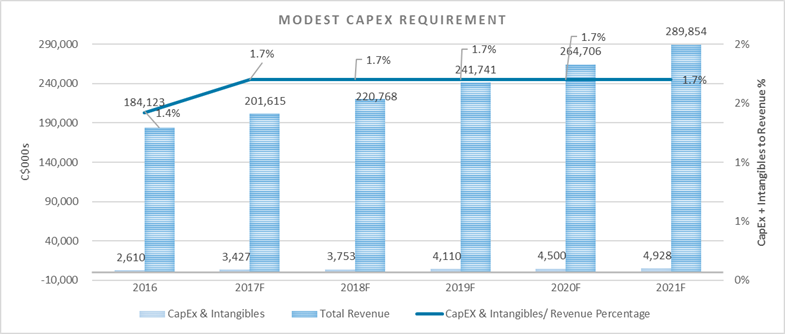 - Modest CapEx requirements ~1.7% of revenues