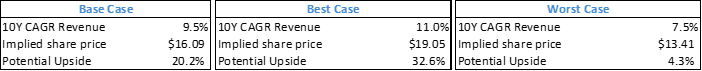 I have built 3 scenarios (Base, Best, Worst) based on revenue growth, gross profit margin, general & administrative margin, to generate 10Y forecast and arrive at implied share price.