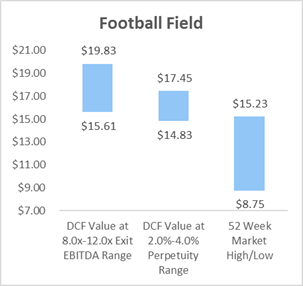 In addition, I modeled an Exit EBITDA Multiple model assuming 11x exit multiple (current EV/EBITDA of 11.7x) on 2026F EBITDA to estimate terminal value. The EV hence consists of the 10Y forecasted FCFF and PV of the terminal value. I estimated an implied share price of $18.85 with a 31.9% upside potential.