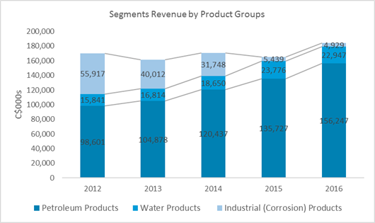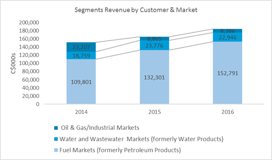 It holds an estimated 60% market share for its fuel category for the overall North American market, which makes its profitability sustainable. Given the aging storage tanks that were installed in the 1980s and the potential environmental issues related to leaking, in addition to the growing entry of big box retailers into the retail fuel selling space makes its highest generating mature segment still lucrative. The company’s water segment is potentially the next highest growing segment as management expects and has potential to grow due to diversified customer base both in Canada and US. The oil and gas sector has faced challenges since the oil price due to reduced new CapEx spending from the industry players but remains important to the business with maintenance CapEx spending and potential new spending at the new normal low oil prices.